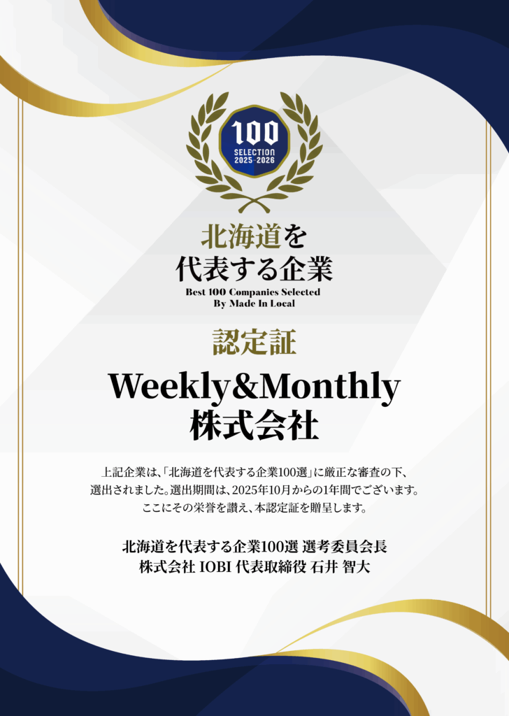 Weekly&Monthly株式会社(本社:北海道札幌市北区、代表取締役:黒木 健次郎)は、株式会社IOBI(本社:大阪府大阪市淀川区、代表取締役:石井 智大)が運営する「Made In Local」にて『北海道を代表する企業100選』に、3年連続で選出されましたことをお知らせいたします。