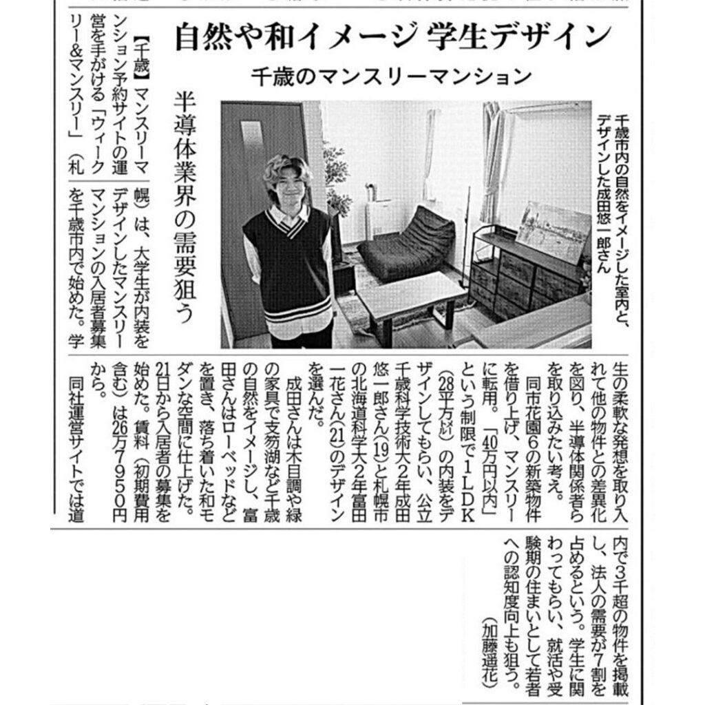 当社が北海道千歳市にて実施した『学生共創マンスリーマンション部屋作りプロジェクト(2026年4月20日実施)』において、学生たちがデザイン・制作を手掛けたお部屋の様子が、2026年4月25日付の北海道新聞に取材・掲載されました。